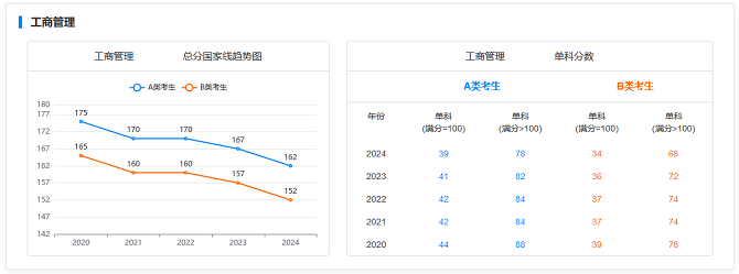 该校MBA每年的国家线都不一样,下面例举2020-2024年国家线变化情况,一起来查看: