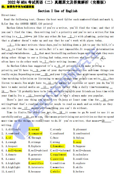 2022年MBA考试英语(二)真题原文及答案解析(完整版)